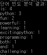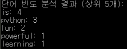 - 출력: 정렬된 단어와 빈도를 반복문을 통해 출력합니다.