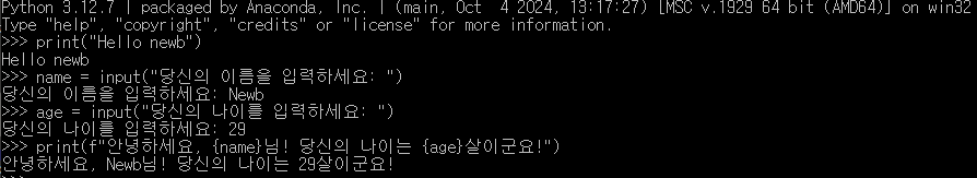 - 자료형: 숫자형(int, float), 문자열(str), 불리언(bool).