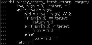 • 정렬된 리스트에서 이진 탐색으로 특정 값을 찾는 프로그램 작성.