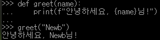 - 함수 정의와 호출: def 키워드 사용.