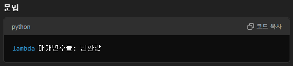 - 람다 함수는 이름이 없는 익명 함수로, lambda 키워드를 사용해 간단하게 정의.