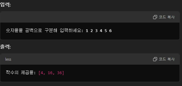 리스트에서 짝수인 숫자만 골라 제곱한 결과를 출력