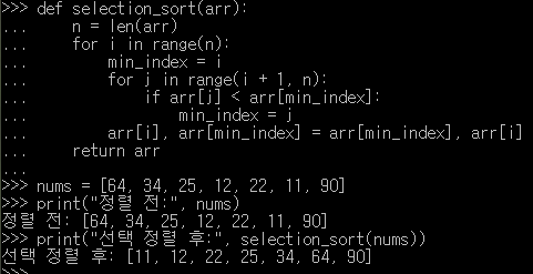 - 개념: 리스트에서 가장 작은 값을 찾아 첫 번째 위치와 교환하며 정렬합니다.