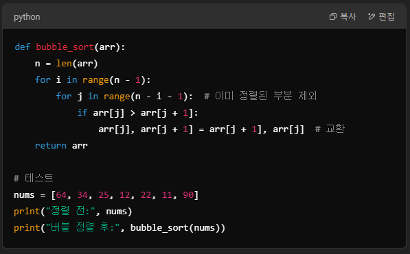 - 개념: 인접한 두 요소를 비교하여 순서가 맞지 않으면 교환하며 정렬합니다.