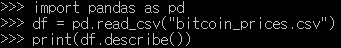 먼저, 코인 가격 데이터의 기본적인 통계 값을 확인.